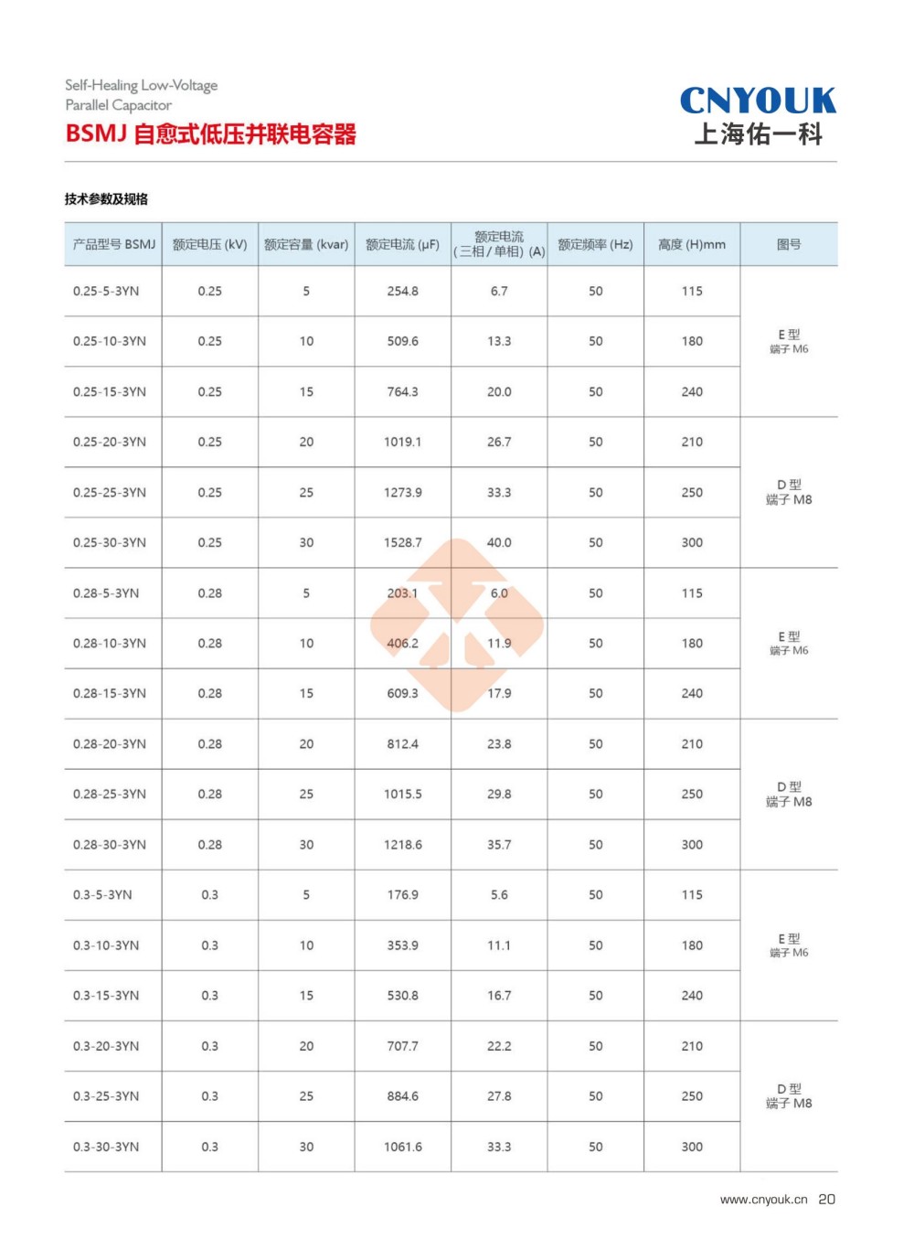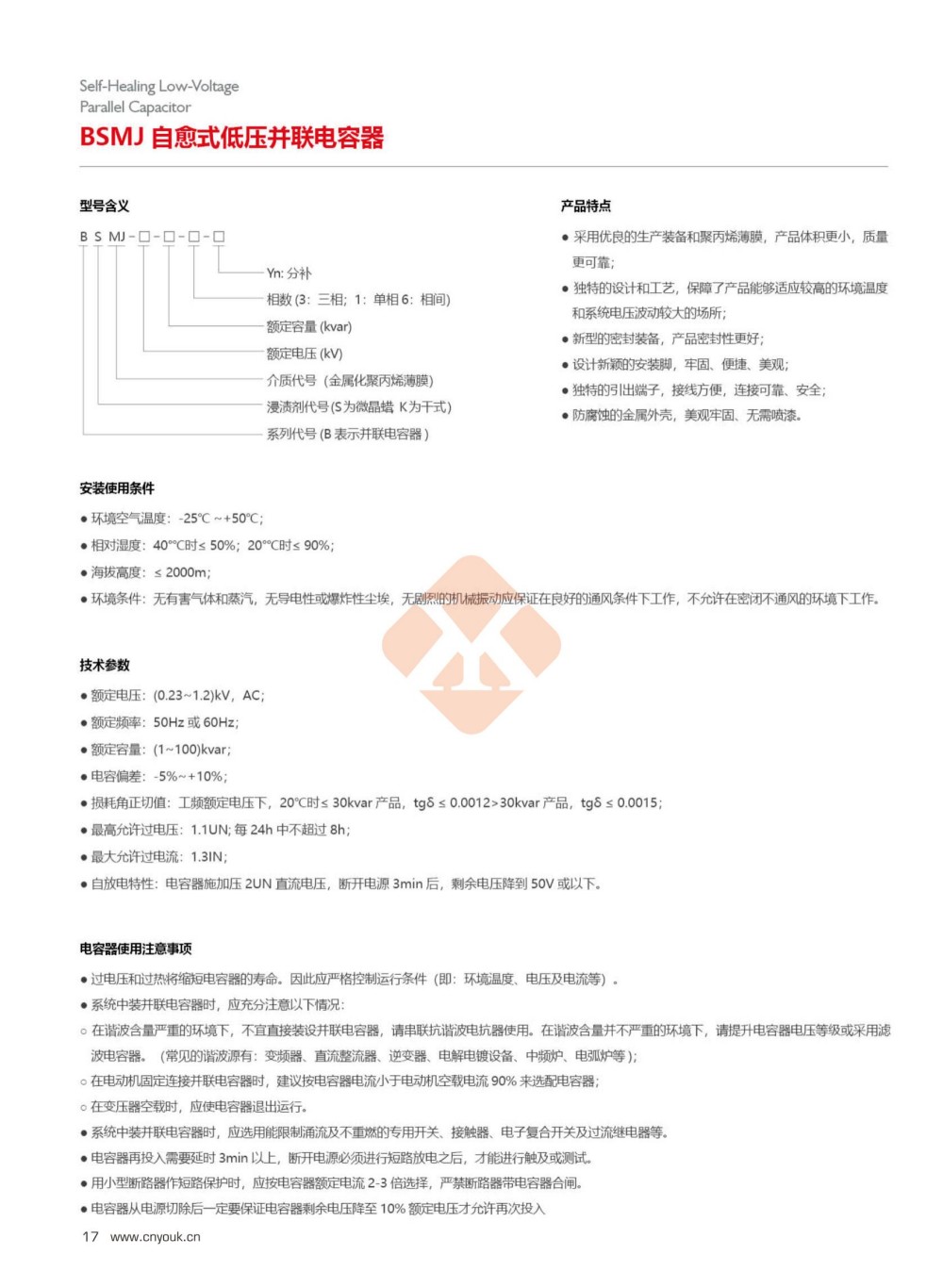 BSMJ系列自愈式低电压并联电容器适用于交流50Hz(60HZ), 额定电压1000V及以下交流电力系统中,作提高功率因数、降低无功损耗、改善电压质量之用。